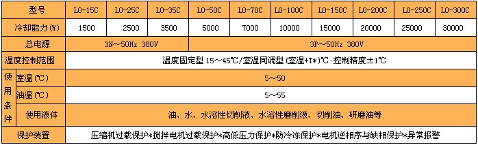 6、機種齊全:(1)、具有冷熱兩用機型,油溫低于10℃時開始加熱,達到13℃時停止加熱。另外可提供高溫型機組。(2)、具有溫度固定型和室溫同調(diào)型兩種控制方式(控制面板可調(diào)節(jié)轉(zhuǎn)換),以滿足不同機床的要求。
