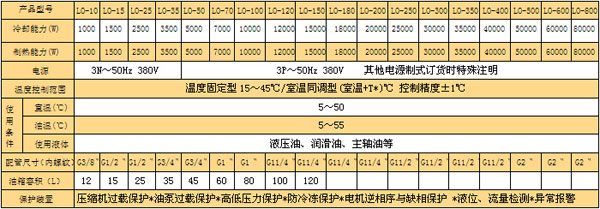 、機種齊全:(1)、具有冷熱兩用機型,油溫低于10℃時開始加熱,達到13℃時停止加熱。另外可提供高溫型機組。(2)、具有溫度固定型和室溫同調型兩種控制方式(控制面板可調節轉換),以滿足不同機床的要求。