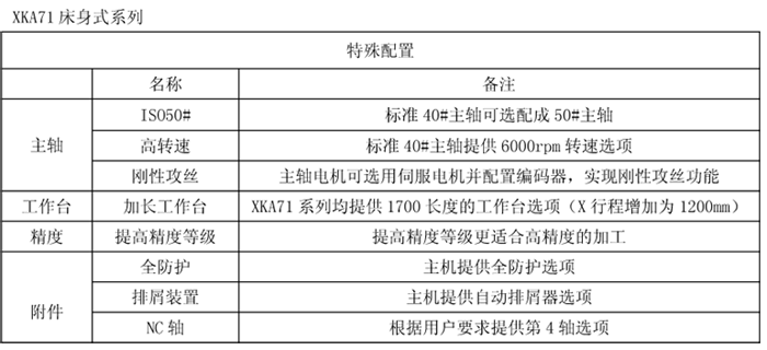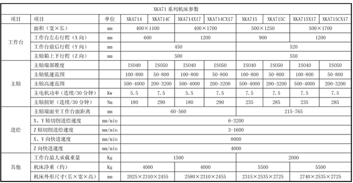 XKA71系列機床是使用范圍很廣的數控銑床,它的橫向(Y向)移動由底座上的滑座來完成,滑座上的工作臺可縱向(X向)移動,立柱上的主軸箱可進行垂向(Z向)移動。工作臺、滑座、主軸箱的移動共同組成了機床X、Y、Z三個軸線方向的運動,可實現三坐標三聯動。三坐標均為滑動導軌,具有承載大、運動平穩、剛性好的特點。 XKA71系列機床采用變頻器實現主軸轉速的無級自動調速,主軸電機與主軸之間由液壓自動兩級齒輪變檔,保證低速區的大扭矩和高速區的大功率的協調,主軸剛性高,保證主軸加工時的平穩性和強力切削實現零件的高表面光潔度。 該機床根據用戶要求可以配置德國西門子828D、FANUC-0iMD、華中818B和廣數983M等數控系統,適用于各行業的機械零件加工。 XKA71系列產品可根據用戶需要選擇特殊配置。