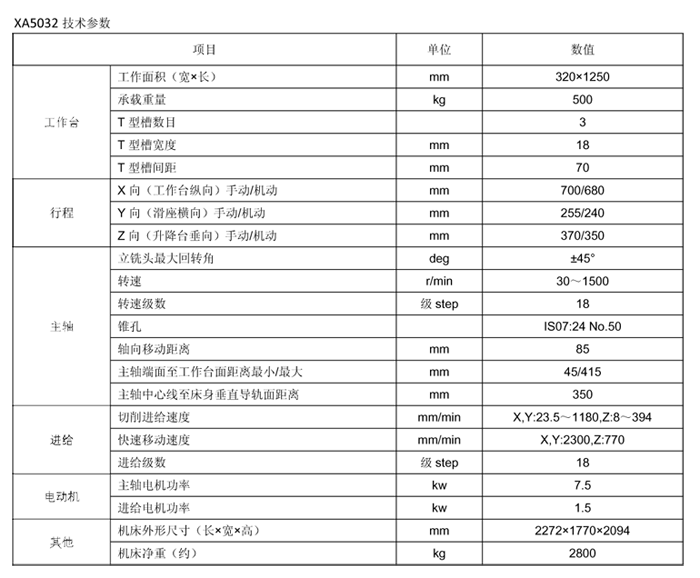 XA5032型立式升降臺銑床是改進型通用產品。該產品操作方便,性能可靠,廣泛適用于各類機械加工部門,加工各種平面、溝槽、齒輪等配置萬能銑頭、圓工作臺、分度頭等銑床附件,可進一步擴大機床使用范圍