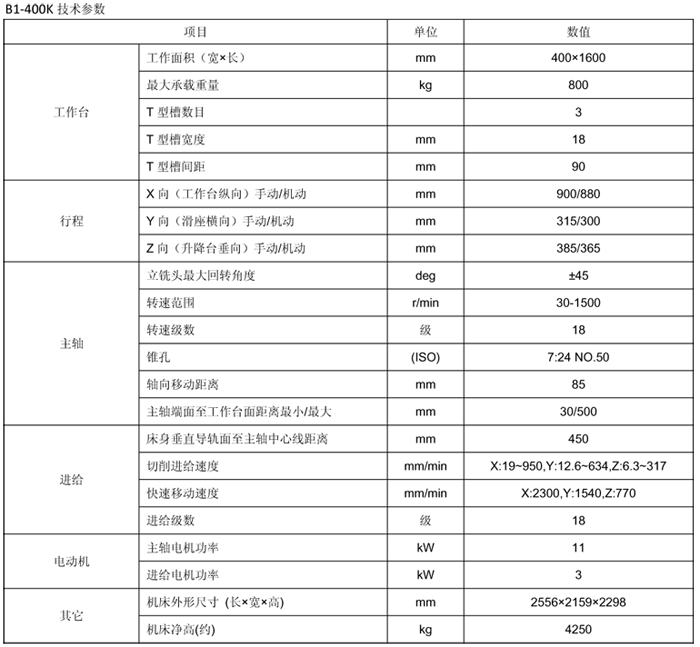 B1-400K 立式升降臺銑床是我廠原X53k基礎上的改型產品。X53k曾榮獲機械工業部頒發的 “質量信得過產品”稱號。該產品結構可靠、性能好、質量穩定、操作方便,適用于各類機械加工,可加工各種平面、溝槽、齒輪等。配置圓工作臺、分度頭等銑床附件,可進一步擴大機床的使用范圍。